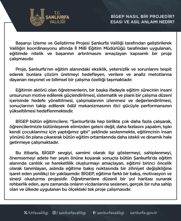 BİGEP(BAŞARIYI İZLEME GELİŞTİRME PROJESİ), ile Şanlıurfa'da eğitim anlamında başarı gösteren öğrenci-öğretmen ve idarecileri ödüllendireceklerinin altını çizen Vali ŞILDAK: ' Hedefimiz enerji oluşturma, ödüllendirme,takip,izleme ve bütün bunlardan doğan bir sinerji , bütün ile dalga dalga yayılacak bir motivasyon zinciri oluşturmakır.' dedi.